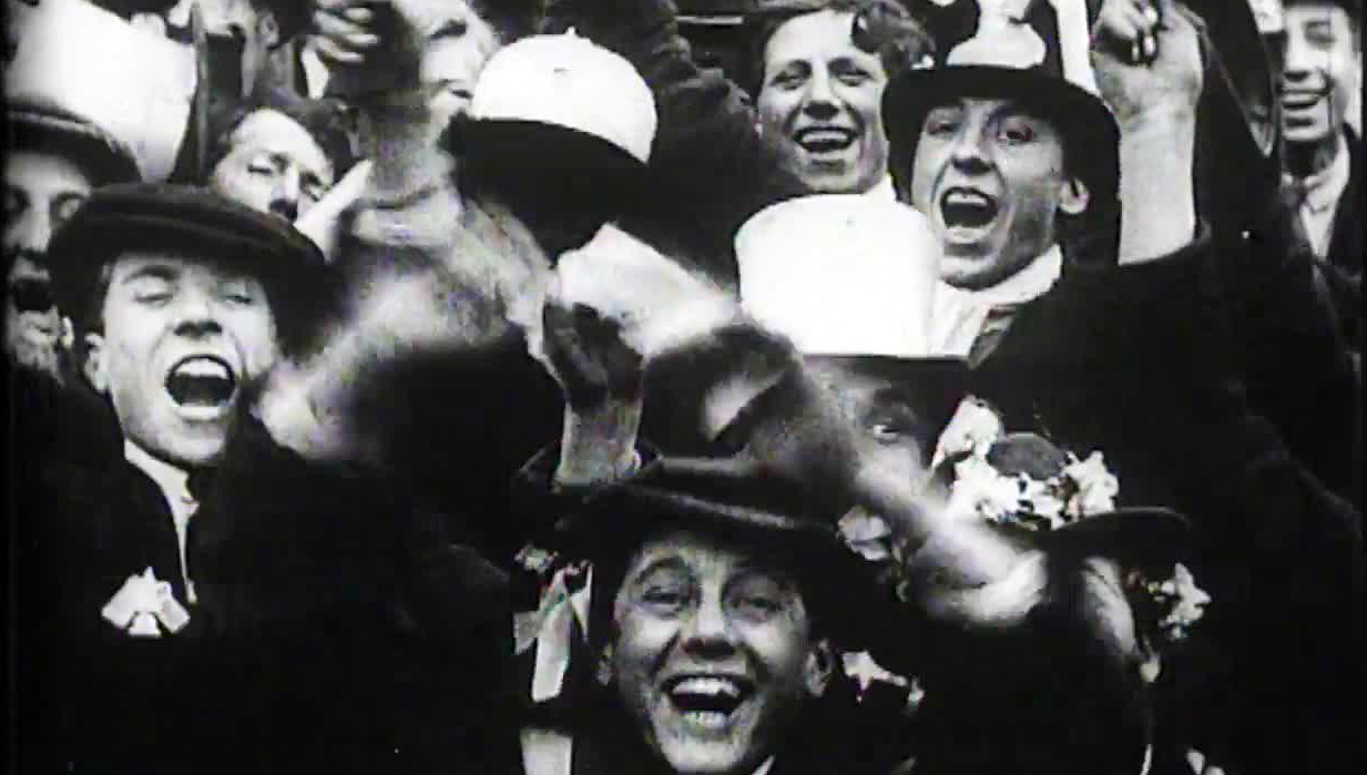 Heavy April showers didn't dampen the spirits of the 72,000-strong crowd at Stamford Bridge for the 1921 FA Cup Final - though for the players the boggy pitch proved a challenge in the first half. The Wolves' goalie, Noel George, valiantly defends his goal until a shot from Spurs' Jimmy Dimmock gets through and seals a victory. An unrestrained crowd clamour to see King George V present the cup to the victors.