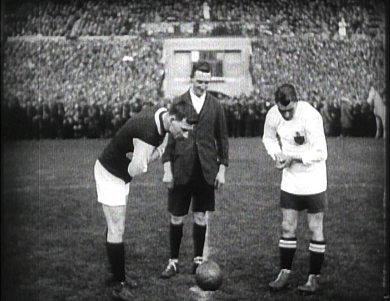 Wembley Stadium hosts its first football match, the Cup Final, with King George V in attendance along with an estimated 250,000 supporters. The capacity for the stadium was 126,000. This film shows extraordinary scenes of crowds swamping the pitch with mounted police galloping amongst the players. The match goes ahead with the crowd (literally) on the sidelines restraining themselves until the final whistle… and Bolton win the cup.