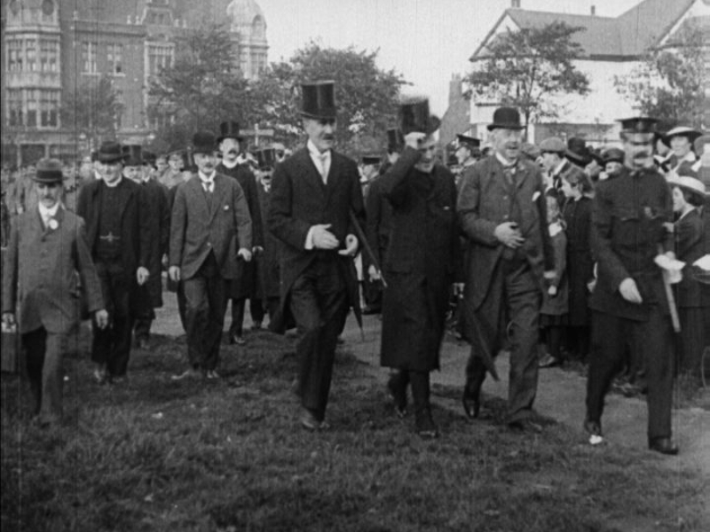 A cadet or scout band march past followed by the Lord Mayor of London, the Bishop of Chelmsford and other top hatted gents who shakes hands. They are followed by a parade of soldiers, firemen and nurses at this outdoor ceremony, held to honour Wanstead men and women’s contribution to the war effort.