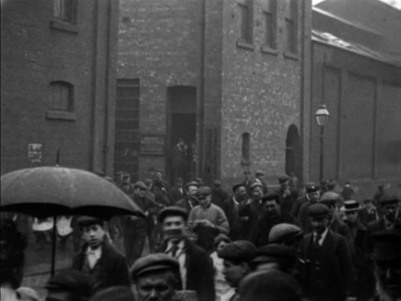 Unusually, the buildings are the dominant feature in this 'factory gate' film; the workers are relegated to the bottom half of the frame. Vickers, a major name in British engineering, was then one of the largest manufacturers on the globe, specialising in transport materials and munitions. Mitchell and Kenyon's camera also visited the same company's Barrow shipbuilding works.