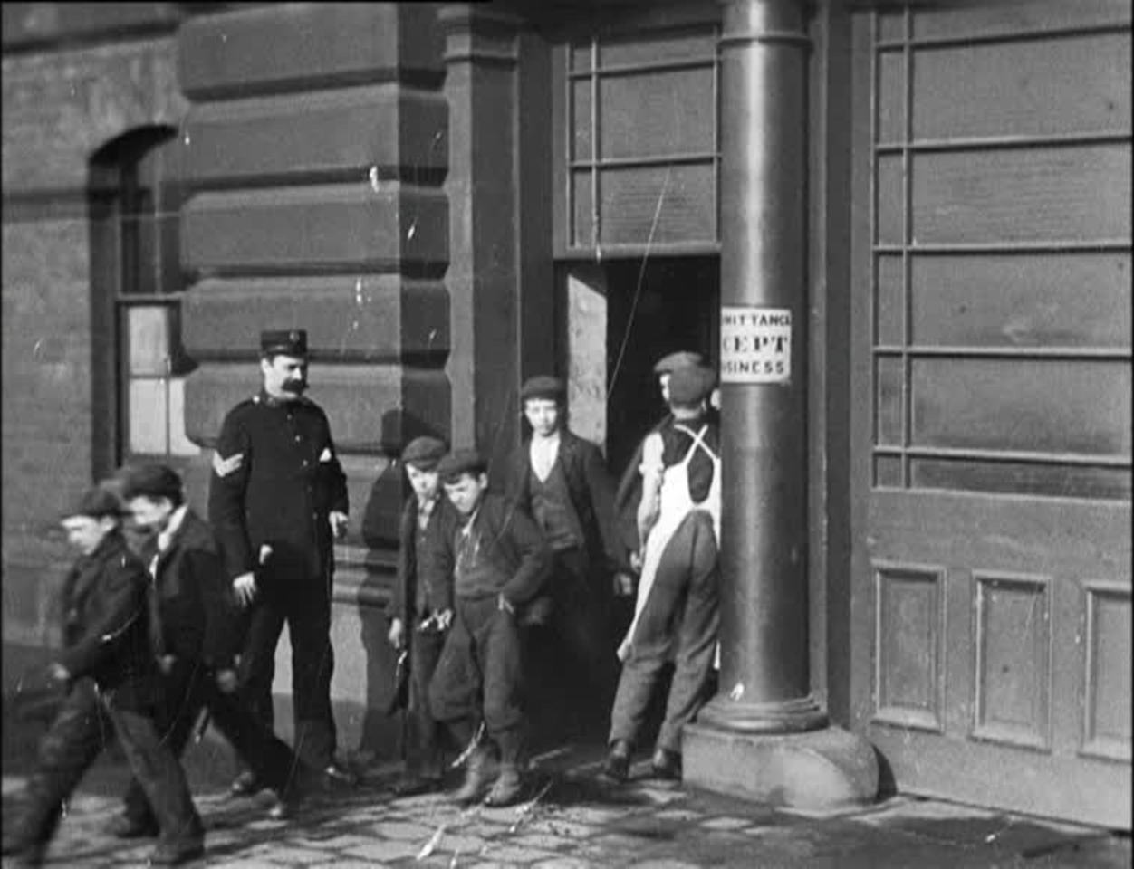 Unusually, these workers leave through the building's front entrance, perhaps indicating that they had just been paid. The boys behave better than in many 'factory gate' films, possibly due to the presence of a burly police sergeant by the entrance. One man sports a wooden leg, although his real leg remains intact, sticking out behind at right angles - could this be relief for a temporary injury?