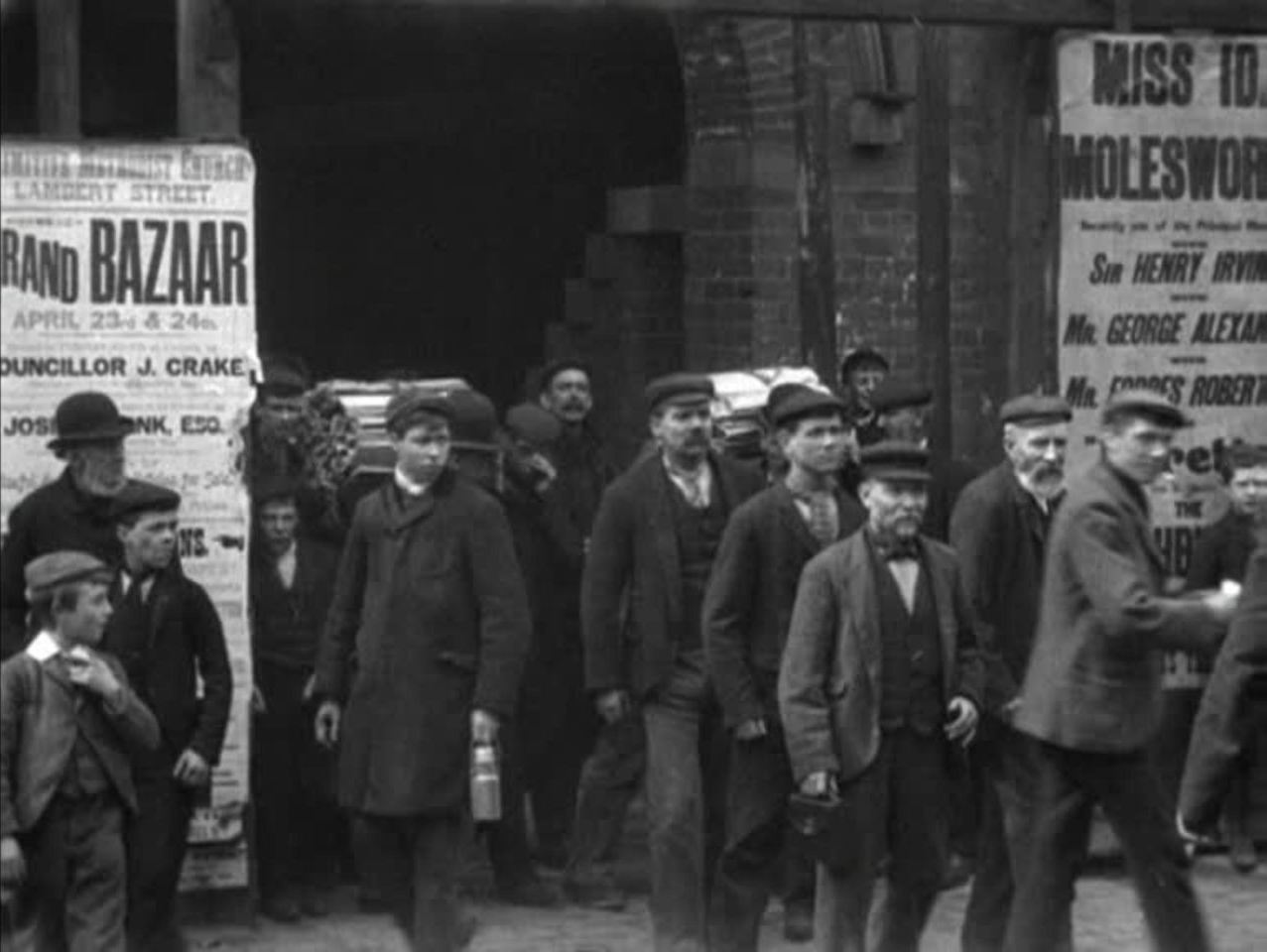 Tired Edwardian workers finish their shift at a Kingston-Upon-Hull paint factory.