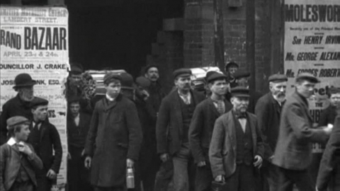 This was one of several films made for screening at Hull's Assembly Rooms in April 1901. Many workers ignore the presence of the camera, but the younger lads are more inquisitive. The view of the factory gate is interrupted by a constant stream of horse-drawn vehicles and the recently introduced electric trams, which pass so close to the camera that you can almost feel the ground shake.