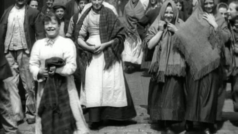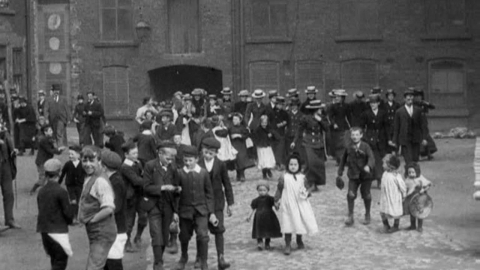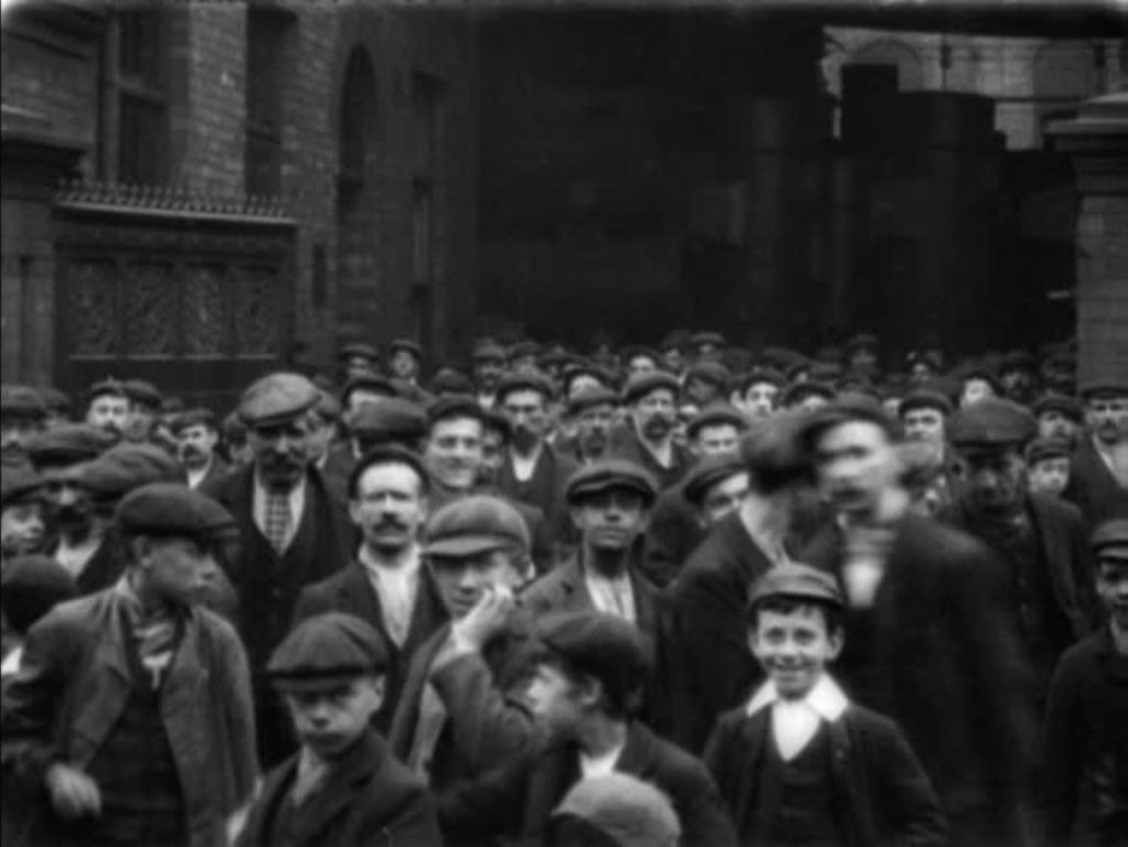 Victorian Manchester mill workers enjoy the novelty of a moving picture camera.
