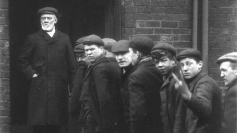 A flood of Lancashire cotton workers and their children at the end of another shift.