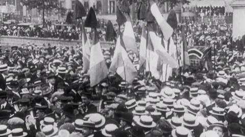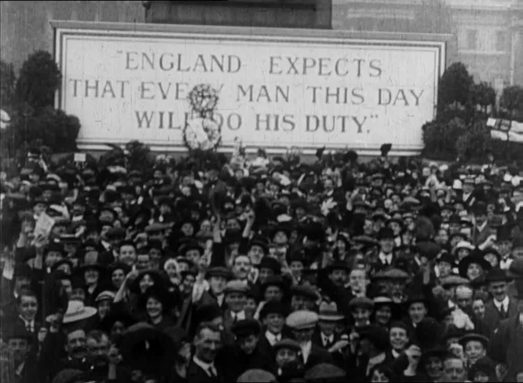 "England expects that every man will do his duty": the words of Lord Nelson, England's greatest naval hero took on new resonance as the nation found itself at war again. Filmed on the first Trafalgar Day of WWI, this newsreel item invites its audience to take pride in former military glories. Clearly, that year at least, the annual memorial served more as recruitment drive than solemn remembrance.