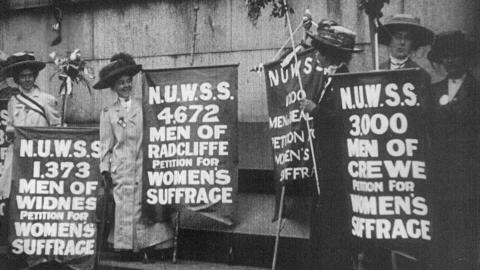 Votes for Women protesters swamp Trafalgar Square, brandishing placards and petitions.