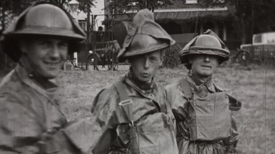 Beginning with evacuees arriving in Herne Bay, this film shows men and women volunteers from the town's First Aid Post and Mobile Units conduct various emergency exercises including the treatment of gas-attack casualties while wearing protective rubber suits, rescuing bomb victims and practising decontamination. There is also a group inspection of Ramsgate's unique air-raid shelter system followed by a large church parade featuring all the volunteer services.
