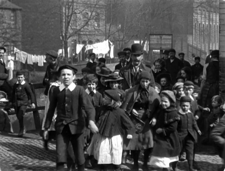 Glimpses of a line of washing lend a picturesque air to these scenes of flat-capped workers in heavily soiled work-clothes dashing home. By 1900, Lincoln's heavy engineering industry was flourishing and it's likely these workers were building locomotives or producing agricultural machinery at one of the many companies based in the city at the time. The name of the factory remains a mystery.