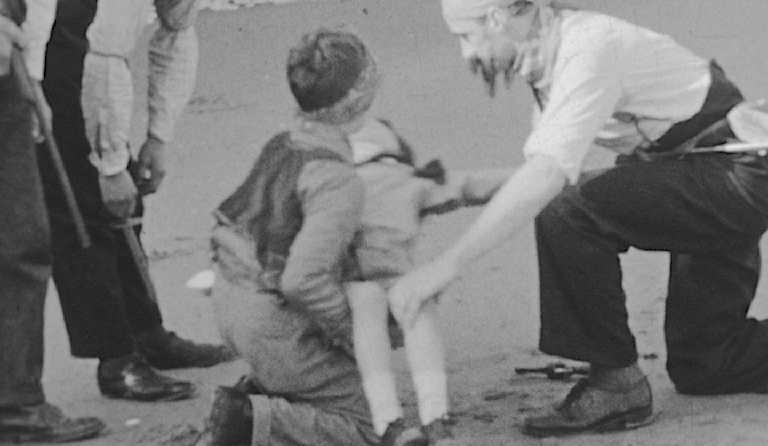This Barnes Brothers film starts with a trio of young bandits, with false beards, boozing in a chalk cliff cave and sharpening knives. One of them emerges from the lair onto the beach where he sees a lone child whose mother has gone to fetch a book. After knocking the child out, he carries her back to the cave. On waking the child escapes but the gang chase after her firing their guns. The girl is shot and her body is put into a sack. The bandits dig a hole in the sand and bury their victim.