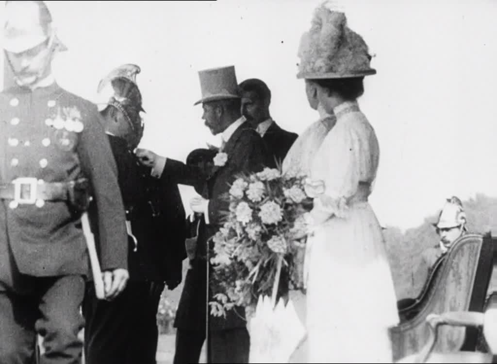Despite all those polished belt buckles, buttons and helmets, the newsreel cameramen prefer to focus on the royal guests rather than the firemen's parade in this story from July 1914. At first the camera isn't best placed to capture the King himself, but it does do justice to the well-practised curtseys of two young flower girls on what was perhaps the biggest day of their young lives.