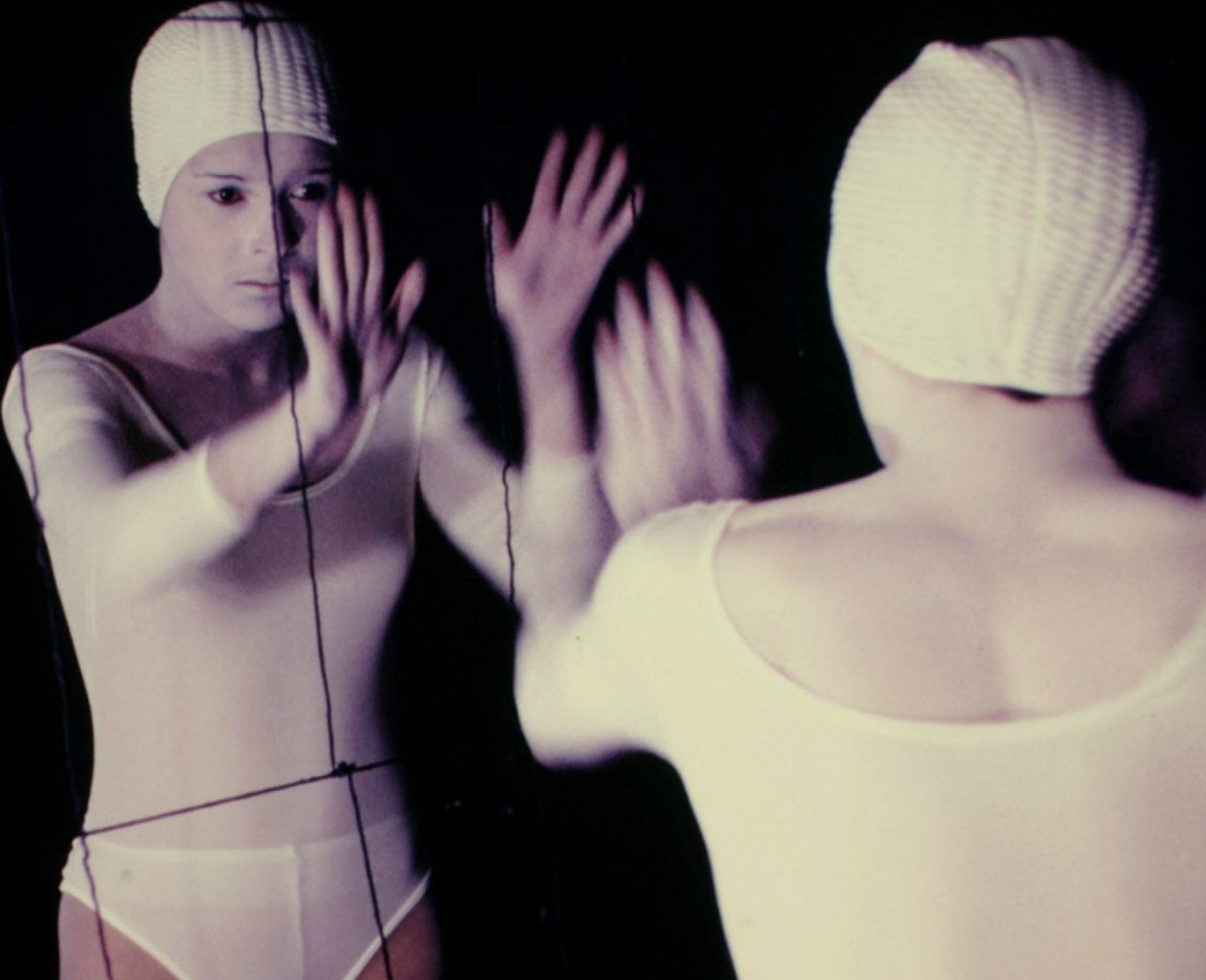 A female dancer performs in front of what appears to be a wall of mirrors until her reflection takes on a life of its own.