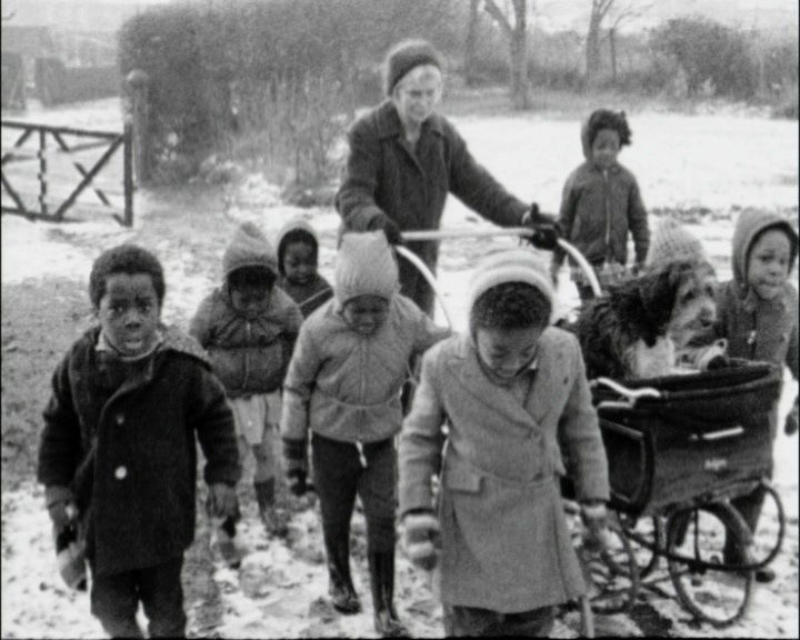 Miss Christie and nine of her eleven foster children return home through the snow. Anglia Television interview Miss Christie about her circumstances and motivations to care for eleven children who all come from black and ethnic minority backgrounds. Miss Christie explains that the mothers of the children are student nurses, and the fathers work in the evenings, so Miss Christie has agreed to give the children a foster home.