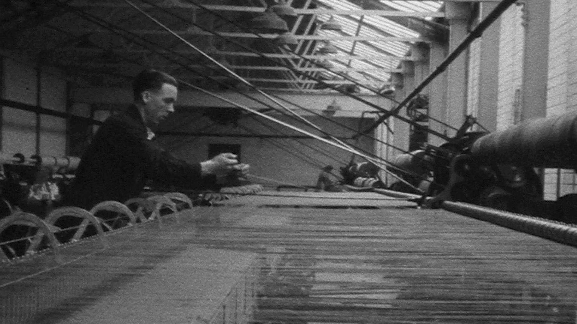 A visit to Premier Mills, Bury, and the firm of Edward W. Andrew Ltd. Lorries deliver bales of cotton and wool - raw materials to be processed and woven into finished cloth. In the dusty air, workers move between the clattering machines; it is a very hands-on industry. Finally, the traditional ritual of clocking off marks the end of the working day.