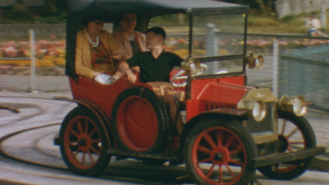 Mother and cousin enjoy a fit of the giggles as mother’s young son drives them round the track and father does the shooting.