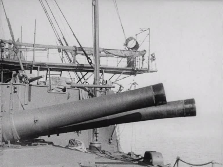 Britannia rules the waves! Scenes of a battleship at gunnery practice, with fine shots of the guns firing.