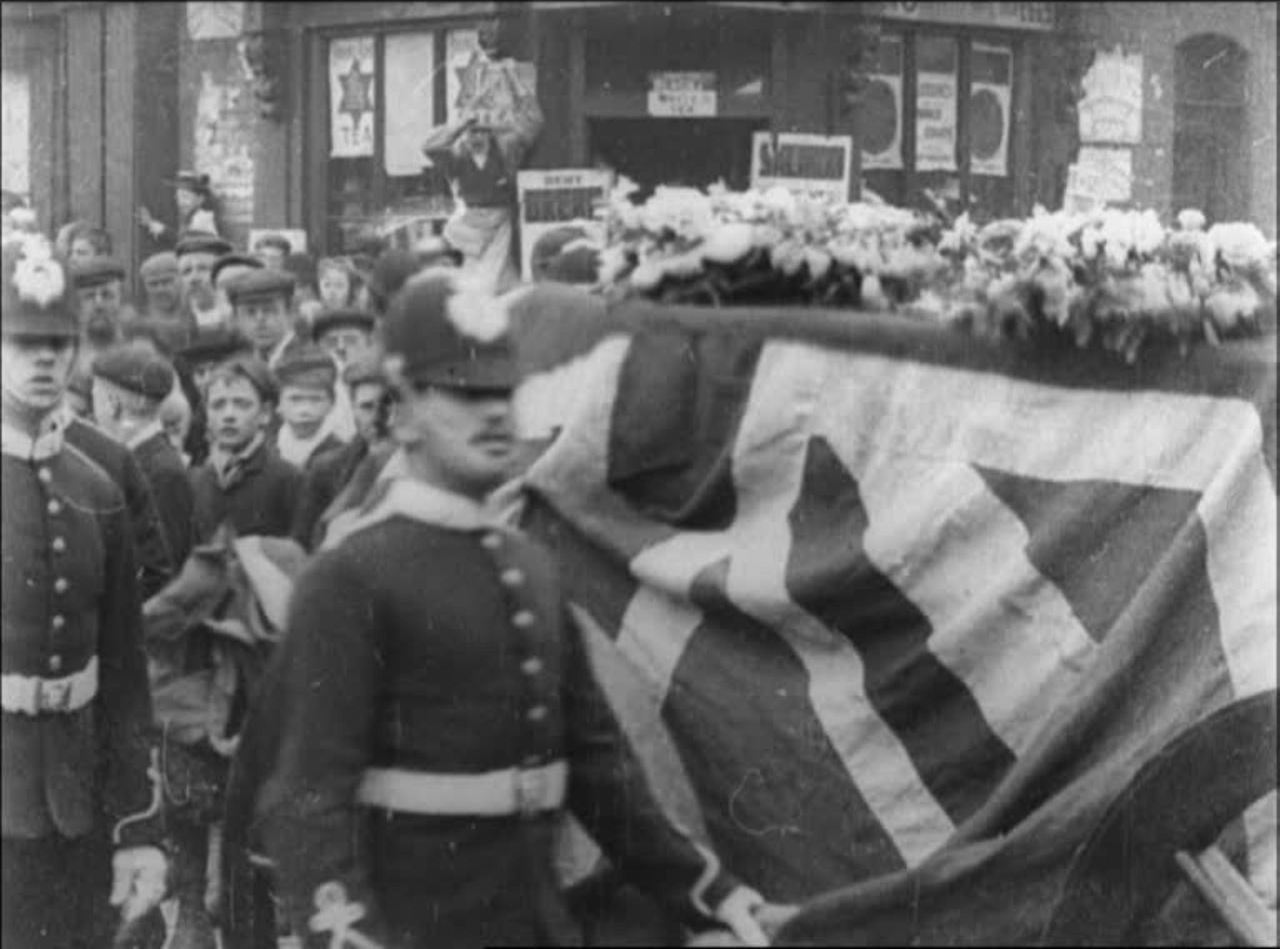 A press article from the Liverpool Daily Post (31 May 1904) makes reference to a screening of the funeral of crew members of the A1 submarine, which met a tragic accident in the Solent in March 1904 and sunk with the loss of all hands. Research suggests, however, that the funeral for the A1 victims took place at Haslar in Hampshire. Clearly there is only one coffin being carried in this film. Could it be a local victim returning home?