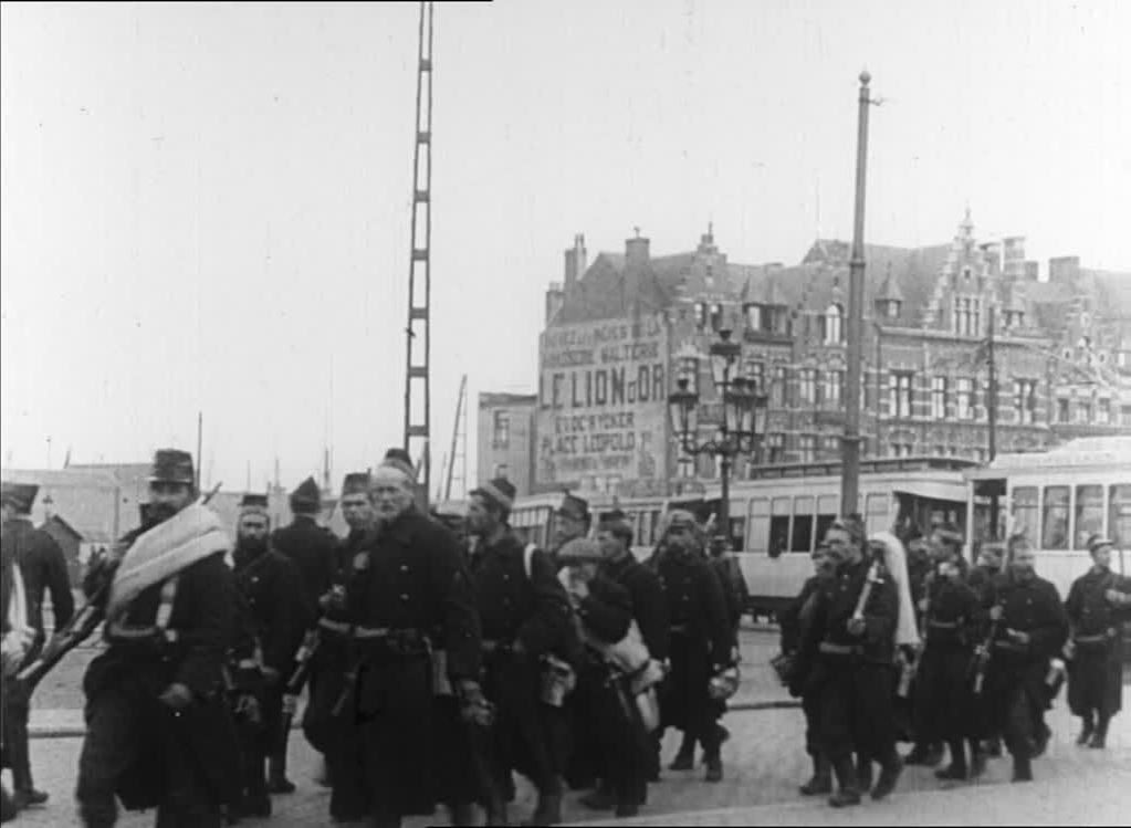 The Topical Budget newsreel defined itself in WWI, and its cameras arrived early in Belgium to document the German occupation, sending back prime images as the situation unfolded. This item was filmed shortly after the week-long Attack on Antwerp, and catches the retreating Belgian troops as they arrive, war-weary, at Ostend. One or two men manage a smile for the camera as they shuffle past.