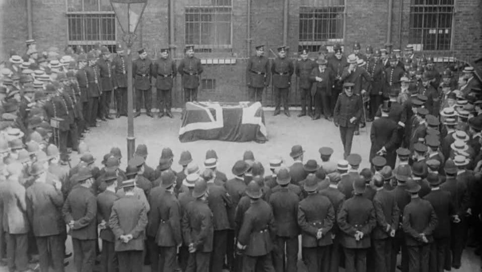 These are the only two surviving stories out of eight produced for the 3 June 1915 issue of the Gaumont Graphic newsreel. Sir Edward Henry, seen in the London story, was head of the Metropolitan Police. It's not immediately obvious why he should be the presiding figure here: perhaps Lieutenant Orwin, the returning soldier, was a police officer in peacetime?