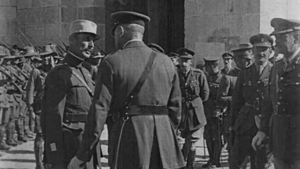 The name in the title of this newsreel belongs to General Allenby, Commander-in-Chief of the British Army's Egyptian Expeditionary Force and the man who led the conquest of Jerusalem, ending centuries of Ottoman rule. But there's no doubting the real star for us today: a then-unknown Thomas Edward Lawrence, later immortalised as Lawrence of Arabia. This is probably the first of Lawrence's very few appearances on film, and it would prove pivotal in building his legend.