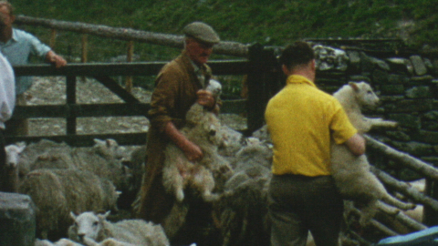 Sheep are gathered in the yard at Glanhirin, Arthur Evans’ farm in the Cwmdauddwr hills. Eunice Evans greets the film-maker’s wife, who has walked from nearby Claerwen Farm, on the doorstep with tea towel in hand – she is preparing to keep 30-odd shearers and neighbours fed for the 2 days of the shearing. At the neighbouring farm, Bodtalog, the shorn sheep, still hobbled, are branded with the letters WP to indicate that they are the property of Will Pugh, a cousin of Arthur’s.