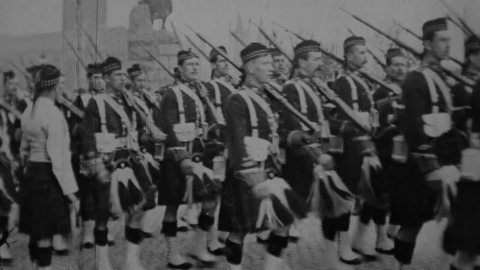 A rambunctious crowd greets the Highlanders in Aberdeen, some more interested in the camera than the soldiers.