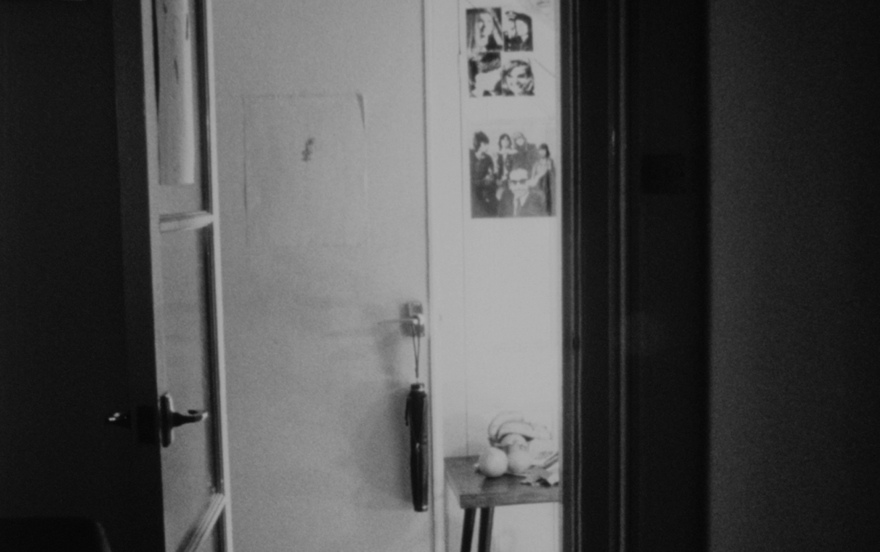 A hallway and a room partially visible, pictures (one of Jean-Luc Godard) on a wall, fruit on a table, and so forth. The commonplace is rendered almost monotonous as we become increasingly familiar with it from a fixed and sustained viewpoint, only to be disoriented by quick, closer cuts and also by the prolonged ringing of an alarm. Through repetition and duration, Peter Gidal seeks “a demystified reaction by the viewer to a demystified situation”.