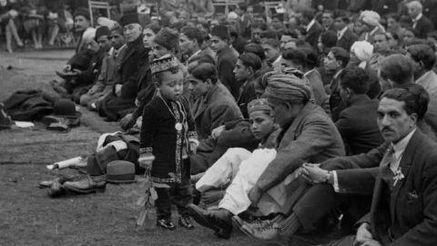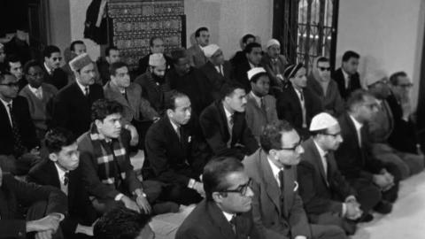 The UK's first purpose-built mosque welcomes a huge crowd of worshippers - and newsreel cameras!