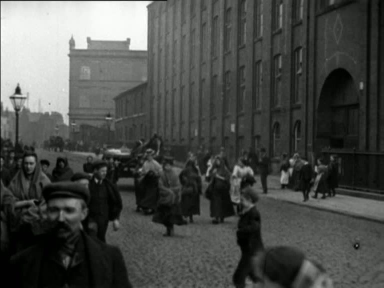 The Egerton Mill was owned by cotton giants Richard Howarth & Sons. At its height Howarth's employed around 4000 people, many of them women and young girls, in their cotton mills and weaving sheds across Salford. Unlike other Mitchell and Kenyon 'factory gate' films, which were concerned with capturing as many workers as possible, this title also offers a wonderful long-shot of Ordsall Lane.