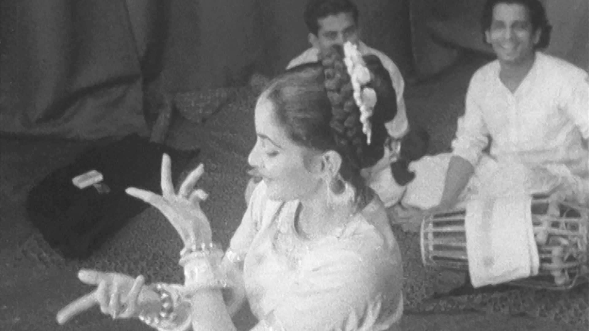 Indrani Rahman (1933-1999) had been Miss India in 1952. She toured Europe and America extensively during the 1960s and '70s performing for many heads of state. She eventually settled in America in 1976. Accompanying her in this performance are her dance guru Deba Prasad Das playing a madal and flute player Srinivasa Murthy.