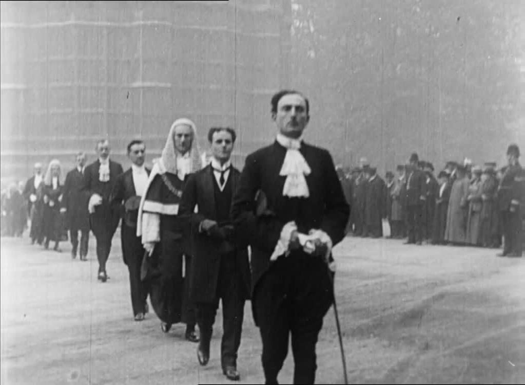 This single-shot newsreel item is about as stiff and straight as the event it describes. The austere formality of the re-opening of Michelmas term at the law courts is written all over the faces of the participants and of their respectful observers. This was exactly the kind of quintessentially British ceremony that the nation's newsreels unerringly lapped up.