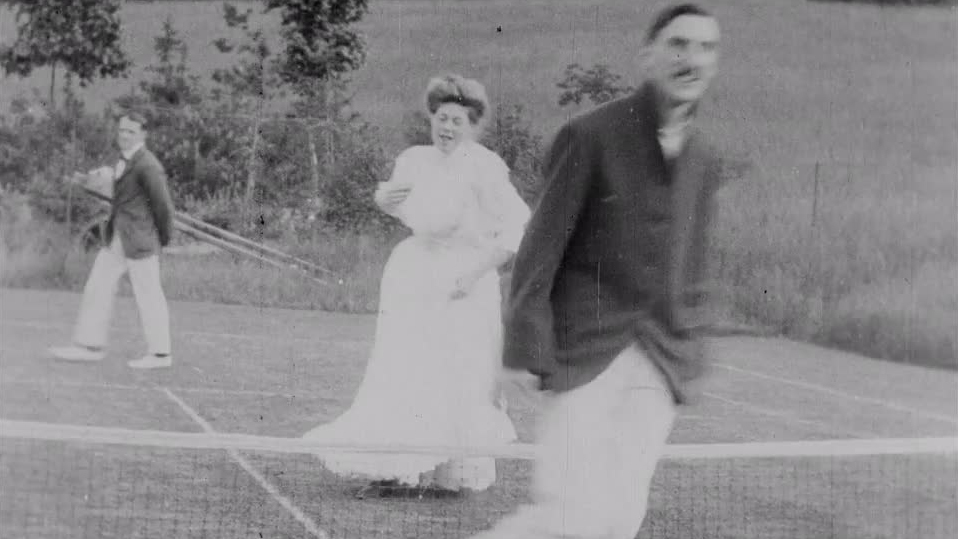 The grown-ups of the Passmore clan let out their inner children as they leap over a tennis net in this early home movie, probably taken at the house of Herbert Passmore in Streatham.