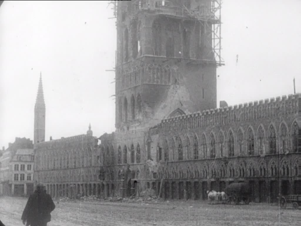 The German Army's bombardment of Ypres continued relentlessly in the months and years after December 1914, when these scenes were filmed. By 1918 almost all the buildings that made up the complex of the Cloth Hall had been completely destroyed, with only a small part of the belfry tower walls of the Town Hall remaining. Since the end of the war, these iconic gothic-style buildings have been completely reconstructed.