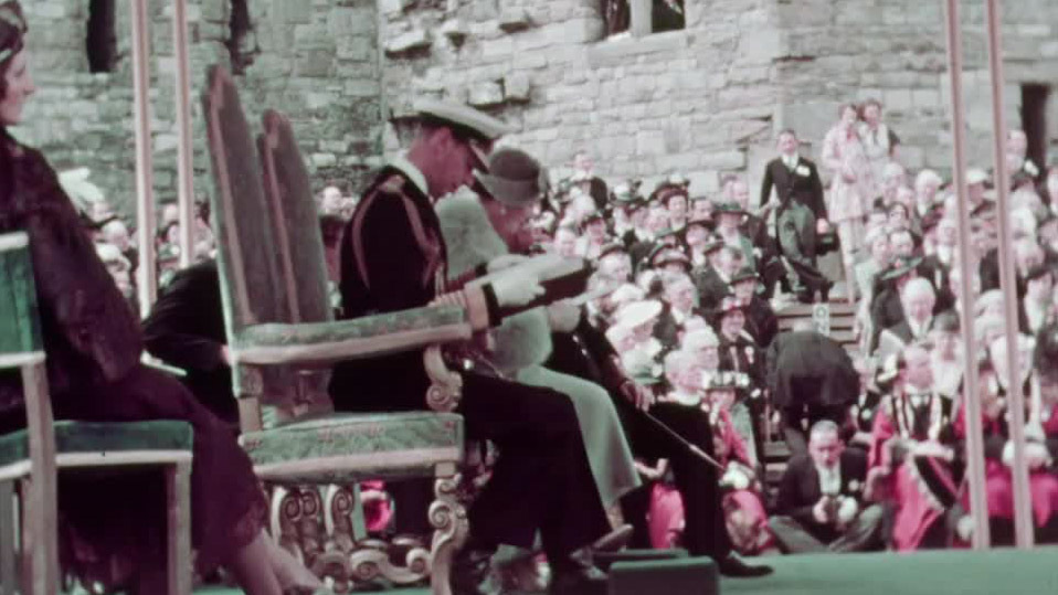 The streets around Caernarvon Castle are crowded with people trying to catch a glimpse of King George VI and Queen Elizabeth in this amateur film by David Lloyd George. The former Prime Minister greets the royal party on their arrival and presents the King with the key to Caernarvon Castle.
