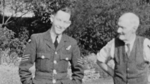 RAF Sergeant Keith Doncaster relaxes on leave in a Derbyshire garden, a peaceful homecoming far removed from the terrors of nightly bombing raids.