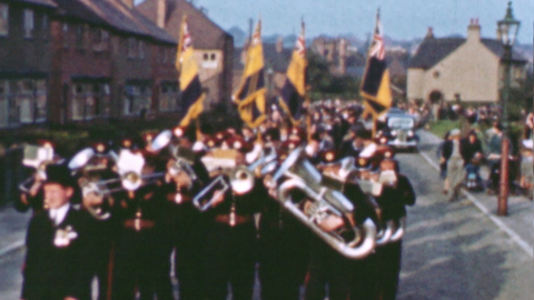 The British Legion proudly march and fly the flag through the streets of Sandiacre in Derbyshire.