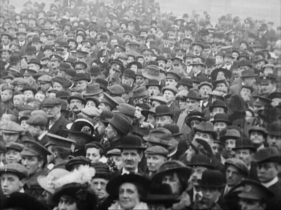 These stirring scenes from November 1915 show Labour MP Will Thorne addressing a rapt crowd in a tightly-packed Trafalgar Square. Thorne's impassioned performance was in support of Lord Derby's appeal - a rally-cry for enlistment issued by the Director General of Recruiting a few weeks before. The patriotic display of brass and banner-wielding goes went down well with Topical Budget's camera.