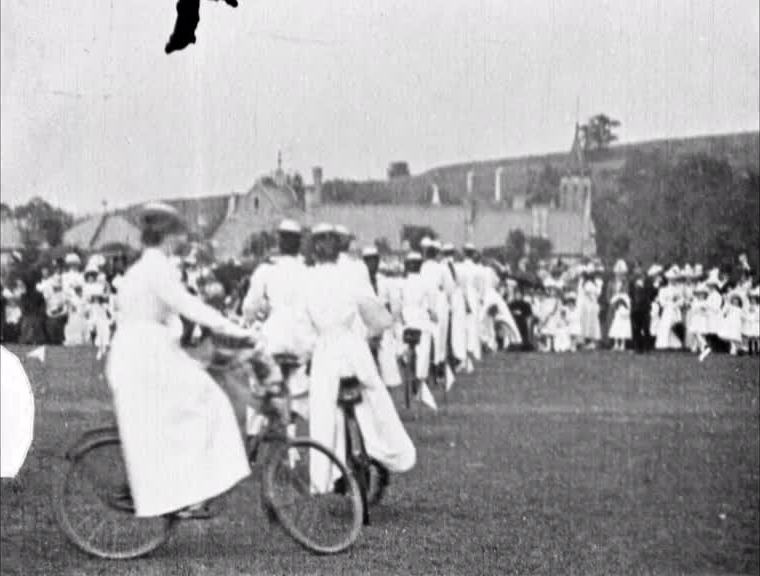 The Victorian bicycling boom led to some bizarre sporting events, such as this synchronized cycle ride. Ladies clubs in particular were encouraged to cycling 'gymkhanas' like this one. This is probably an event at Catford in 1899, captured by film pioneer Cecil Hepworth, but there was also a similar event at the Glasgow Exhibition of 1901.