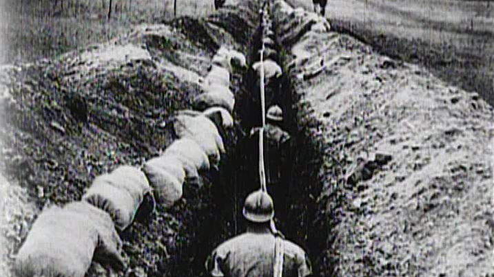 What these men wouldn't give for a mobile phone. Communication in war is key, and with the Western Front extending over 400 miles, both the telephone and the telegraph were essential to maintaining a coordinated campaign. This film is a great witness to the efforts of the unsung engineers as they lug cables down a six-foot trench, dug by hand, that stretches off onto the horizon.