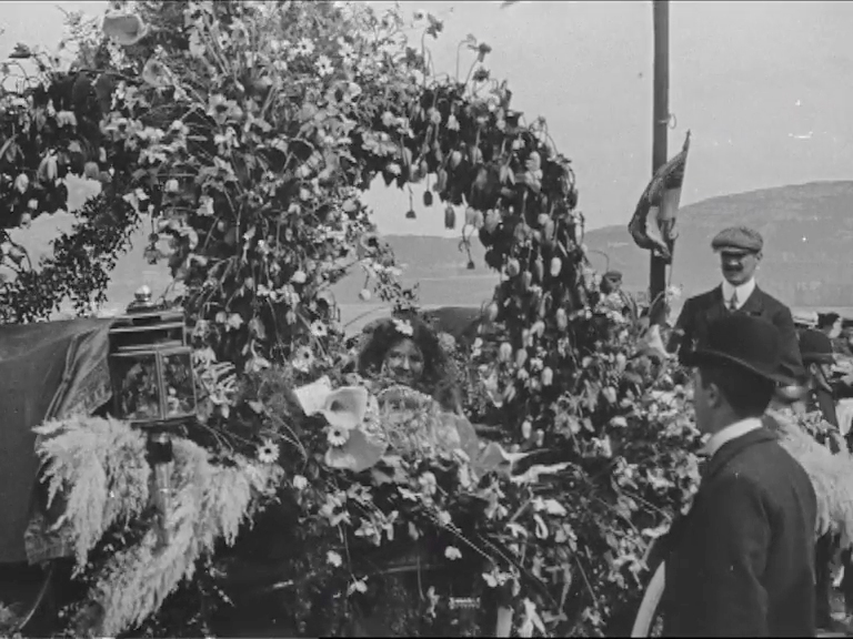 No doubt May Queen Doris Ward, seen seated and smiling in a flower-covered carriage, had many admirers, but most eyes would have been fixed on the still novel sight of a film camera. Local traders certainly recognised the potential of the 'animated pictures' and harnessed them to promote their wares. Exhibitor Mr J Ritson is seen in one shot, carrying a billboard advertising 'Parisian Animated Pictures'.
