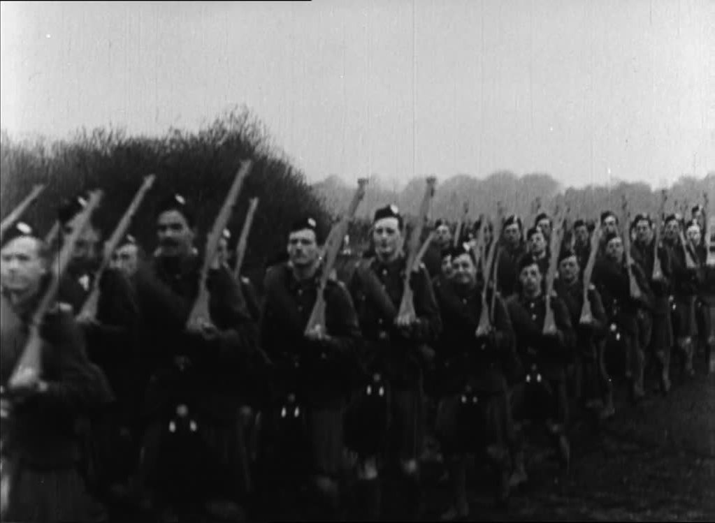 Thanks to a well-chosen position, the camera picks out the smiling faces of these marching soldiers from the London Scottish Battalion, also known as the 'Cockney Jocks' or 'Piccadilly Allsorts'. Their good humour is well-earned: the regiment was being lauded for its contribution to an allied counter offensive in Ypres, Belgium, which successfully repulsed German attacks.