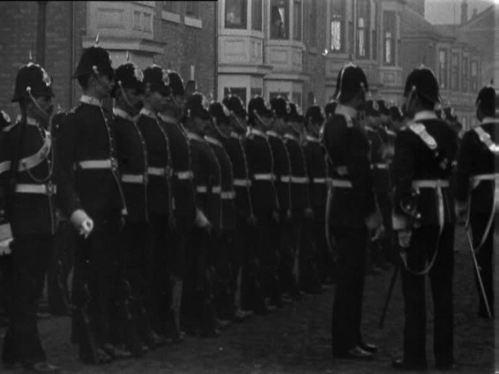 This extremely well-crafted actuality story shows the local lads of the Third Volunteer Battalion of the Durham Light Infantry receiving honours in front of their drill hall ground at the top of Sunderland's High Street West. Twenty-five men were nominated for awards, but by the time this presentation was filmed by Mitchell & Kenyon's camera, five had already returned to action in South Africa.