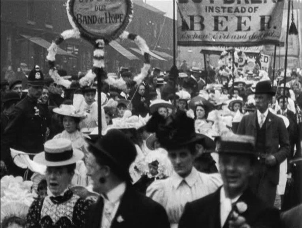A temperance society decries the demon drink on the streets of Edwardian Manchester.