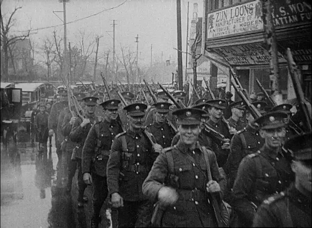 Major-General Sir John Duncan, commanding officer of the recently created Shanghai Defence Force, is seen saluting troops in front of the British Consulate. Also seen is Admiral Sir Reginald Tyrwhitt, then the senior British official in the region.