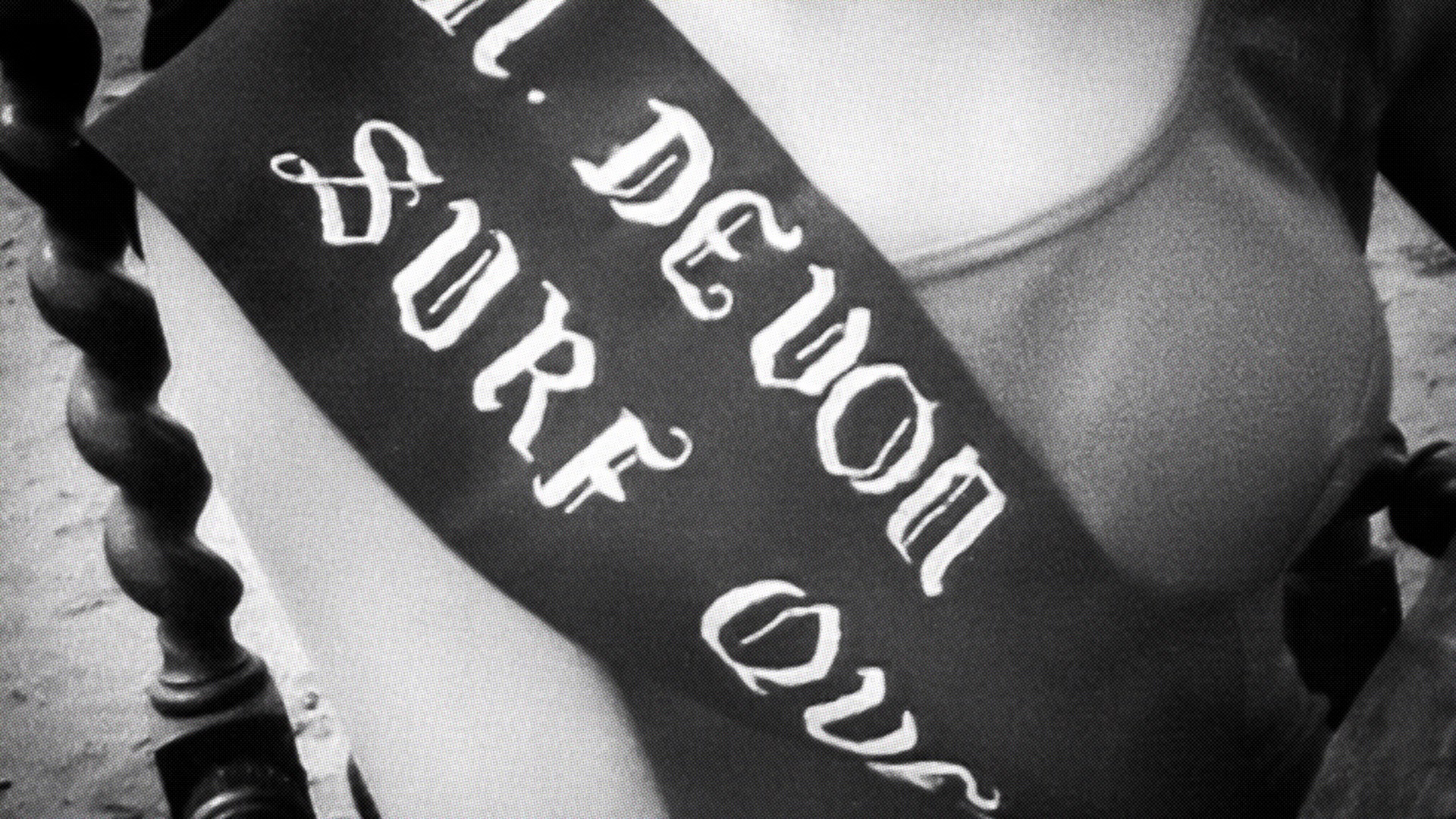 Women line up on Woolacombe Beach to covet the crown or rather tiara, red sash, blushes and flowers of Miss Surf Queen North Devon. This must be the beachwear round then! This is the surf life championships and a demonstration of life saving is put on by the Woolacombe women's section. Surf lifeguards patrol beaches throughout the summer season. Lycra was actually invented in 1958 and went on to revolutionise fashion and help with precision swimwear.