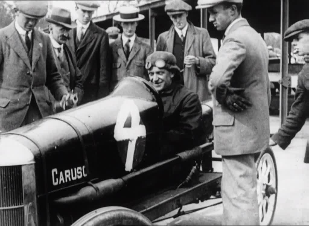 Despite the tantalising promise of the title, this Topical Budget newsreel item doesn't deliver racing rivalry between cars and aeroplanes. Instead, close-up shots of two unidentified drivers bookend scenes of a motor race in action. But hang on for the final scene, when a biplane soars low over the parked cars - evidence of Brooklands' nearby airfield.