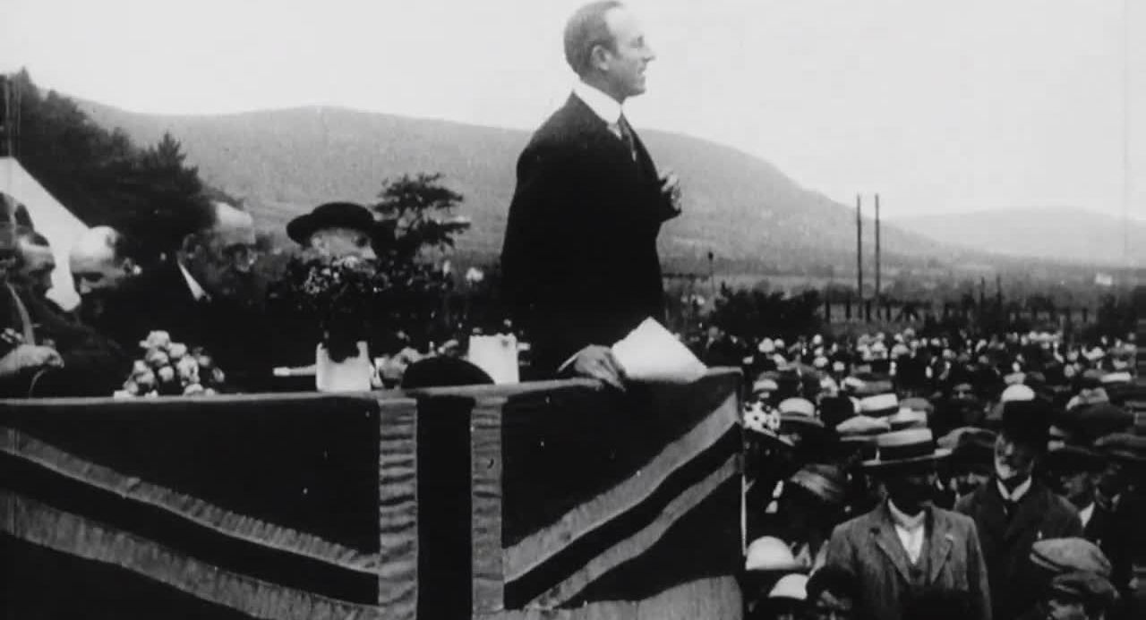 Ulster’s loyalists flex their muscles on their annual 12th July parade, the last to take place during World War One. They are captured on film by newsreel Gaumont Graphic. Turbulent events in Ireland were a recurring newsreel subject; the 12th being an annual event, cameras could confidently be dispatched in advance. A shot of Orangemen parading Belfast’s streets is followed by leading Unionist politicians addressing crowds.