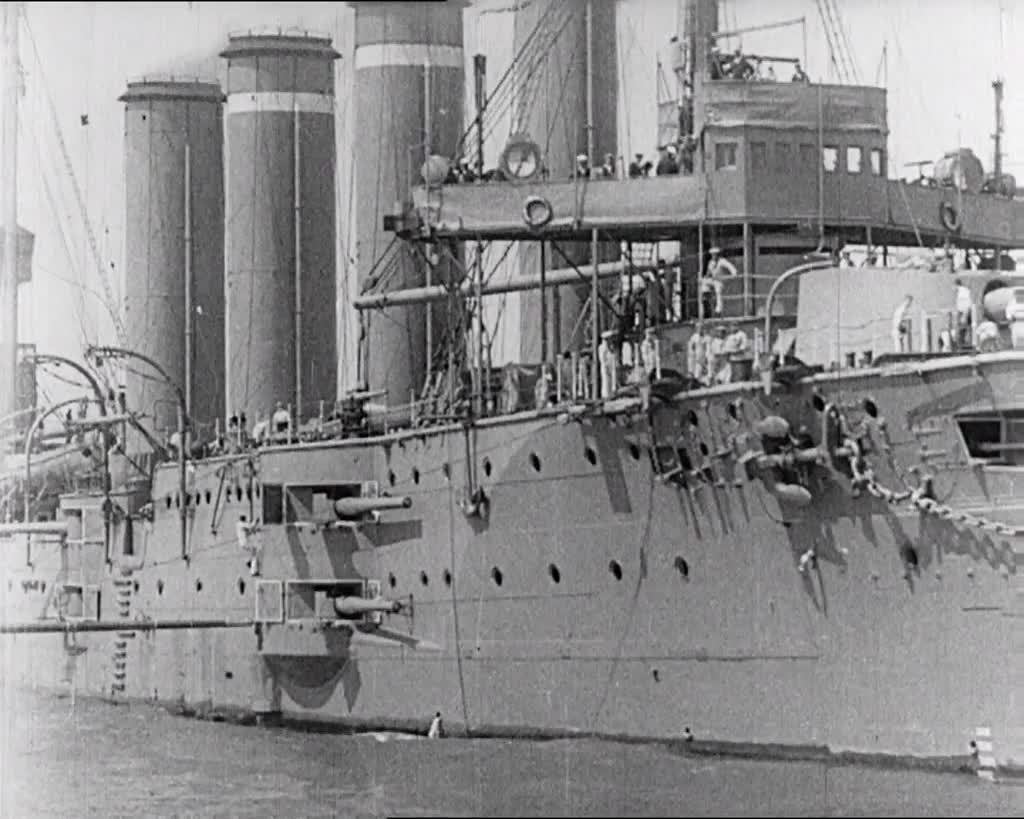 This newsreel eulogy to British ships sunk in action is a poignant memorial to the thousands of men who lost their lives at sea in the first months of WWI. The film is composed of shots of the ships afloat and features HMS Monmouth and HMS Good Hope - both sunk in the Battle of Coronel, off the Chile coast, on 1 November - and HMS Hogue, sunk by a German submarine in the North Sea on 22 September.