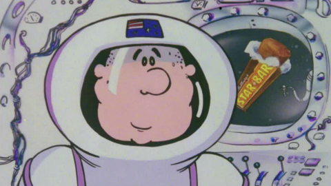 An animated spaceman finds a Star Bar which gives him an energy boost.