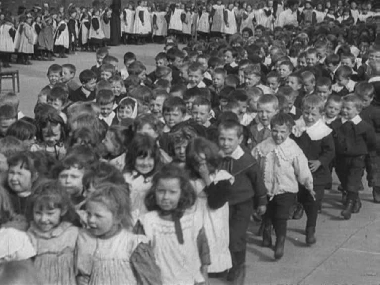 A multitude of Lancashire schoolchildren is ushered past the camera.